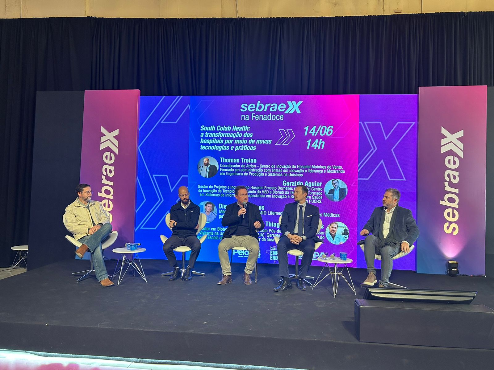 Após, o grupo se dirigiu para a Arena da Inovação SebraeX na Fenadoce, onde todos prestigiaram o painel intitulado ‘South Collab Health: a transformação dos hospitais por meio de novas tecnologias e práticas’, que teve uma discussão muito rica com os convidados: